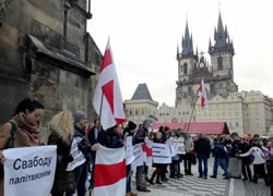 Актывісты беларускіх і чэскіх няўрадывых арганізацыяў у гадавіну Плошчы арганізавалі пікет пад старажытным гадзіньнікам на Старамесцкай плошчы ў Празе.